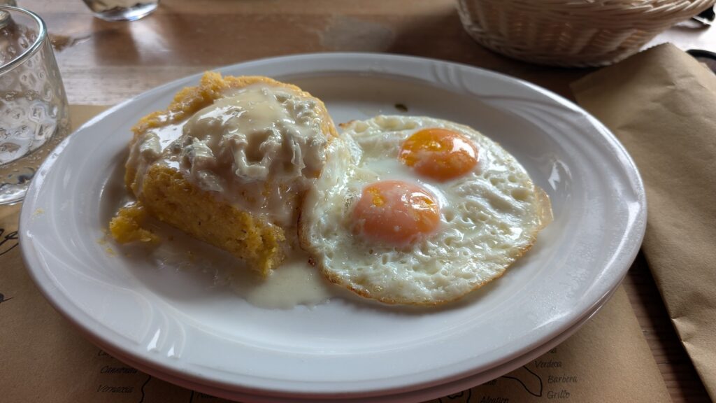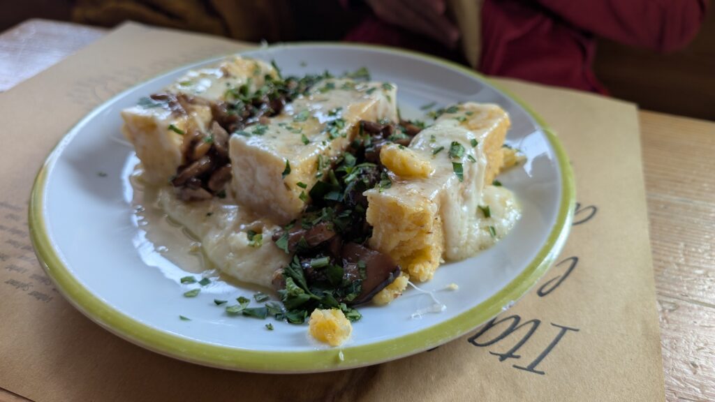 - pyszny obiad- 19 euro (w tym polenta zapiekana z serem pleśniowym oraz sadzone jajka, do tego kawałek ciasta oraz woda, za drugim razem pyszna tradycyjna zupa valpellinense z kapustą i serem Fontina, piwo bezalkoholowe oraz pyszne ciasto czekoladowe)