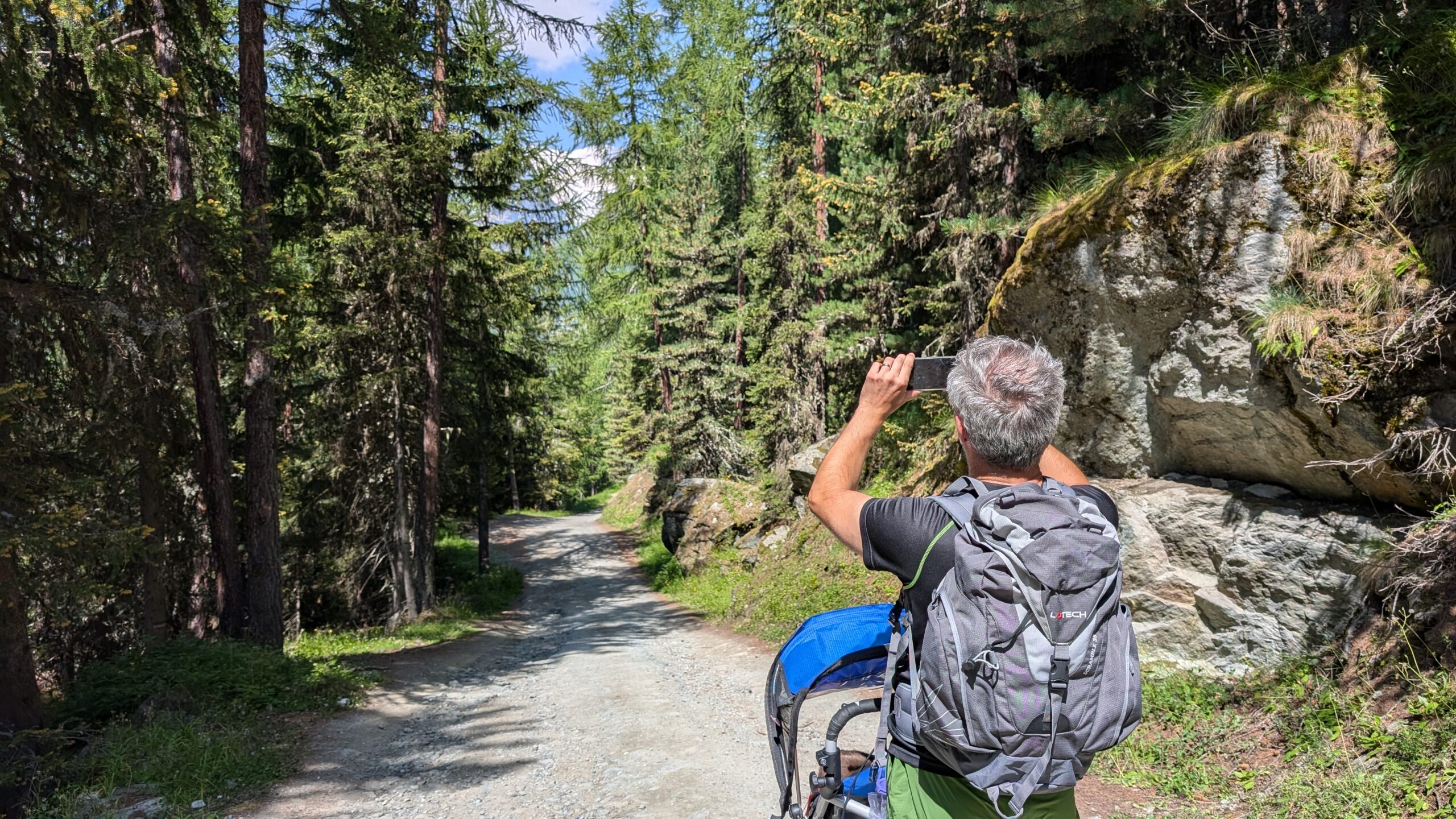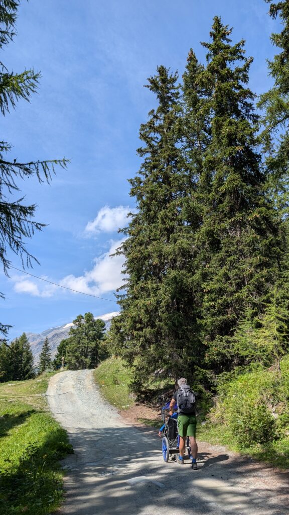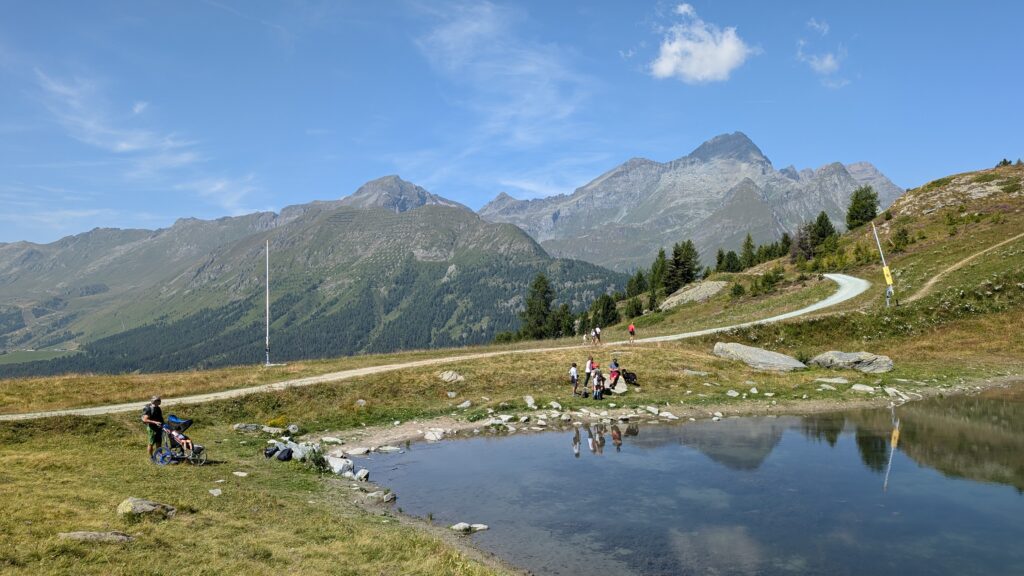 Na początek zbaczamy odrobinę z trasy, by zajrzeć nad Jezioro Żab. To dodatkowe 30–40 minut marszu pod górę, ale warto. Tafla jeziora odbijająca alpejskie niebo zostaje w pamięci na długo. Po drodze spotkaliśmy dużo starszych osób i rodzin z dziećmi, ale byliśmy jedyni z wózkiem. Trochę nas to kosztowało wysiłku, ale odpoczynek przy jeziorze wynagradza wszelkie trudy.