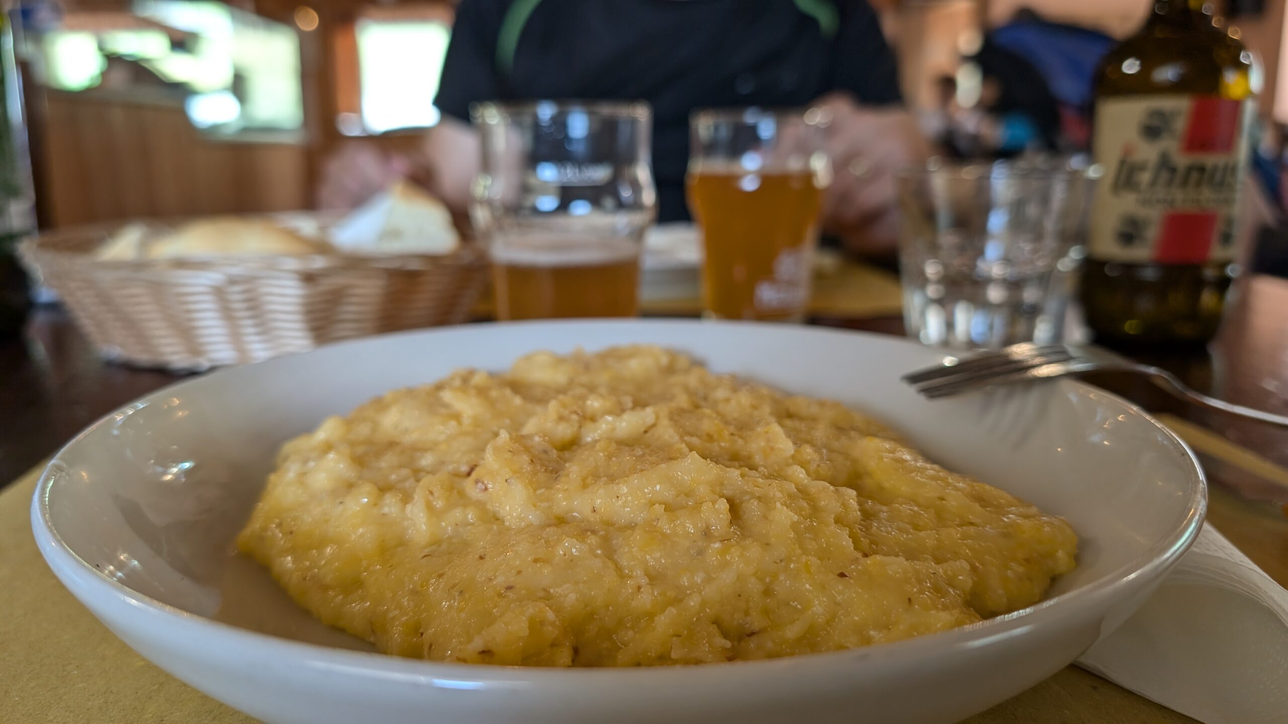 Wracamy na główny szlak, ale wcześniej wracamy do Crest coś zjeść. Wybieram polentę concię, czyli przysmak z mąki kukurydzianej zapiekanej z serem. Jest to danie, które uwielbiam i często wybieram w górach. Tu poczytacie o niej więcej: Polenta concia czyli przysmak z serem.